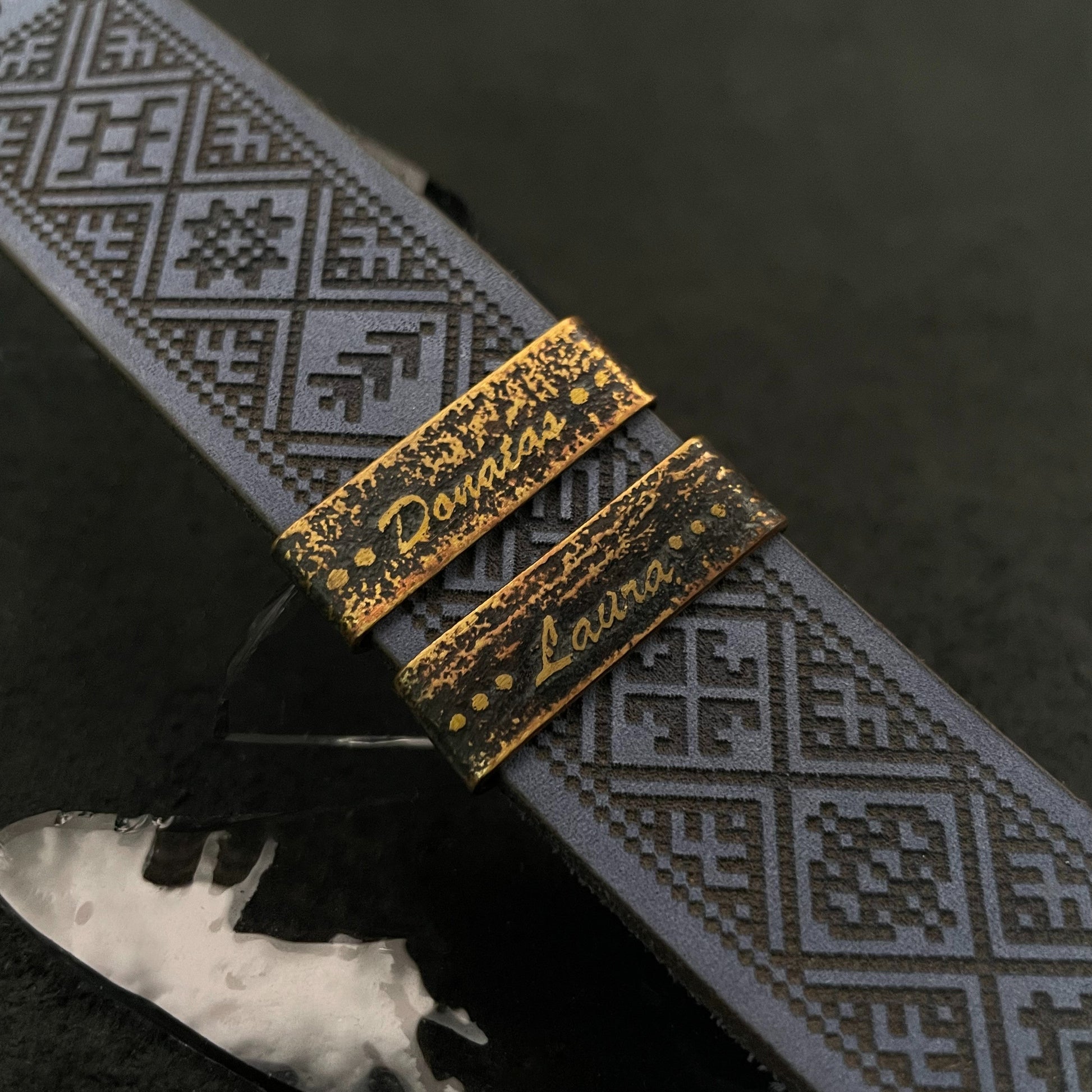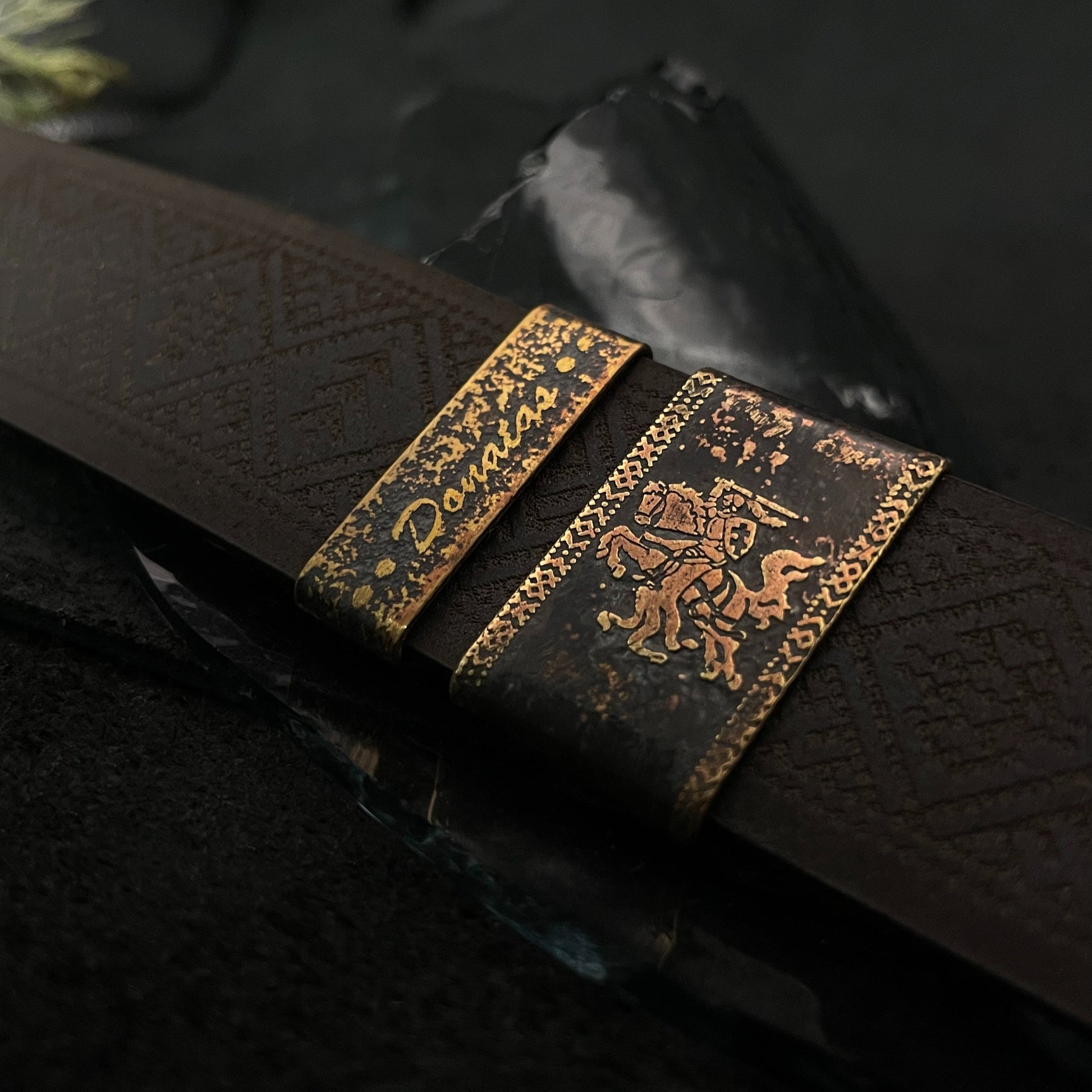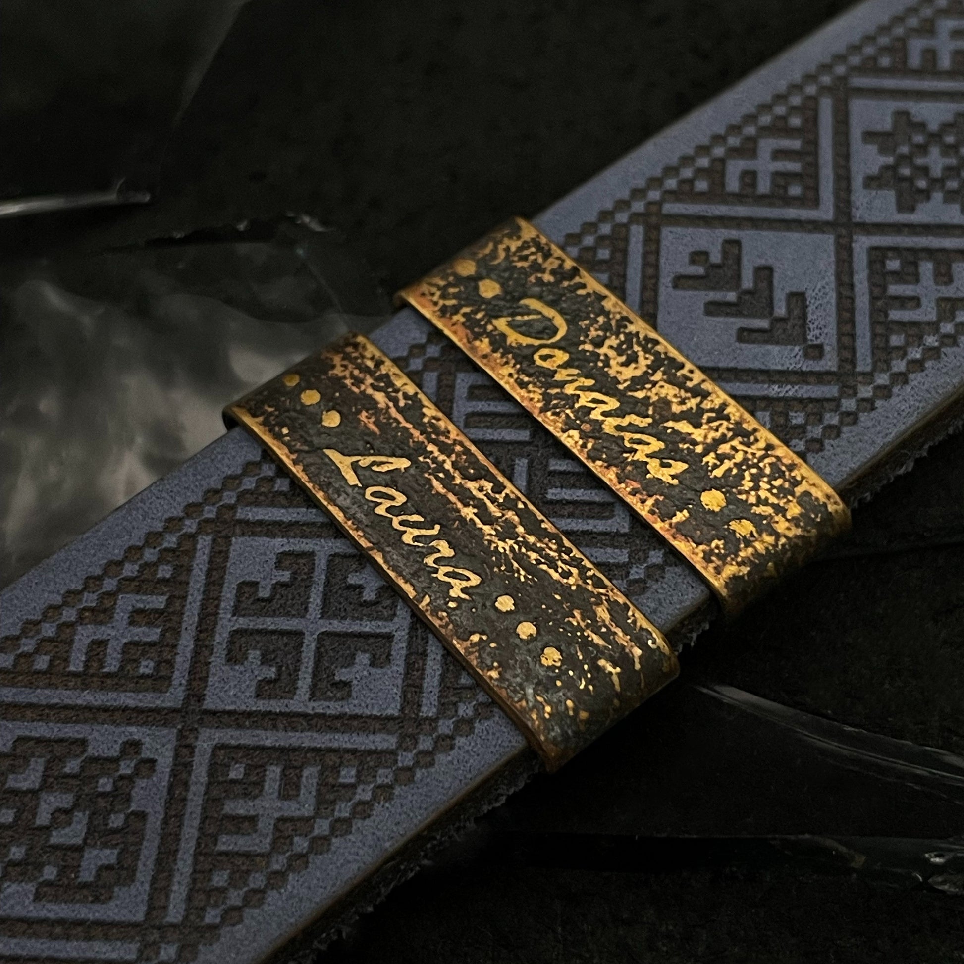 Tai simbolinis papuošalas, praturtinantis odinę apyrankę žalvariniu akcentu.