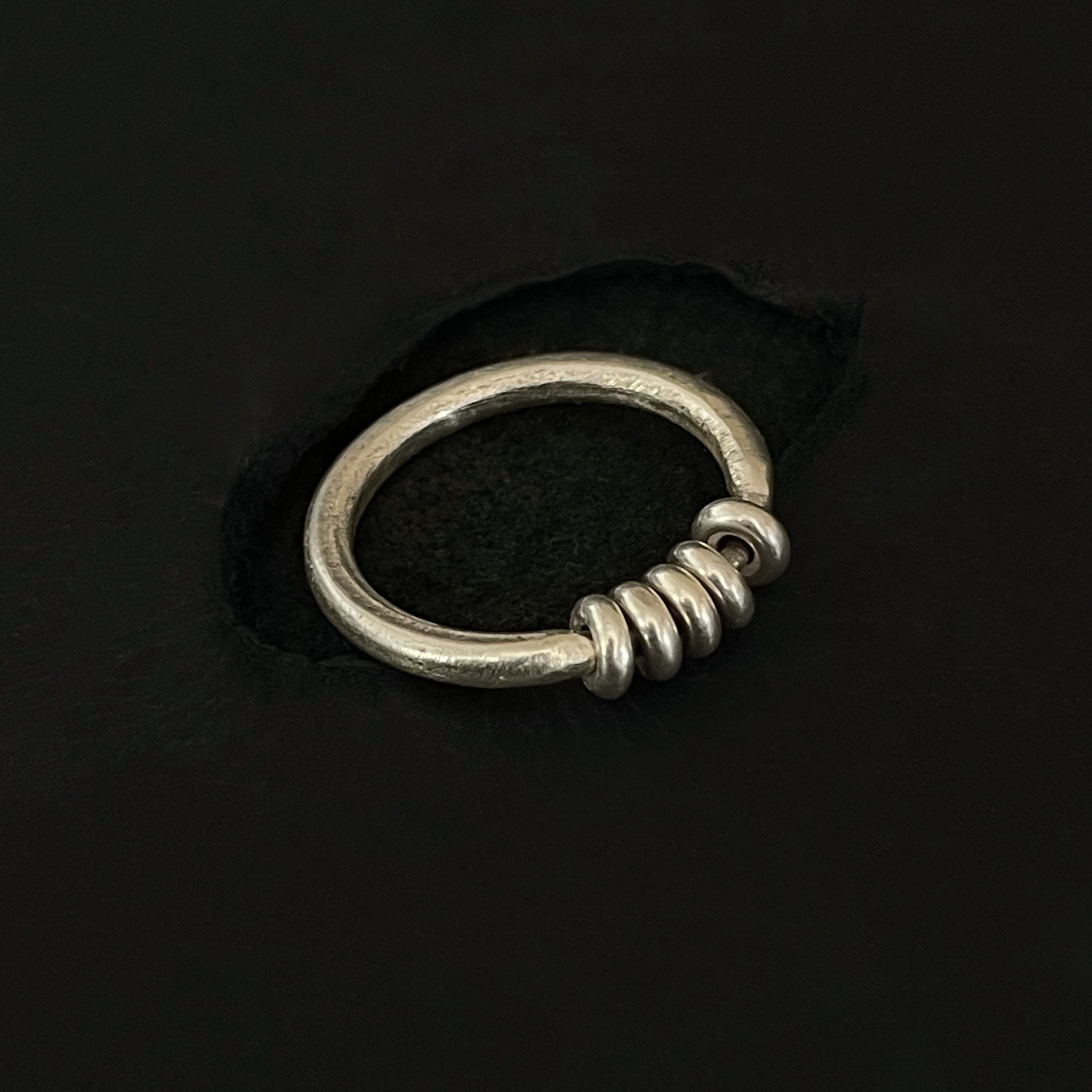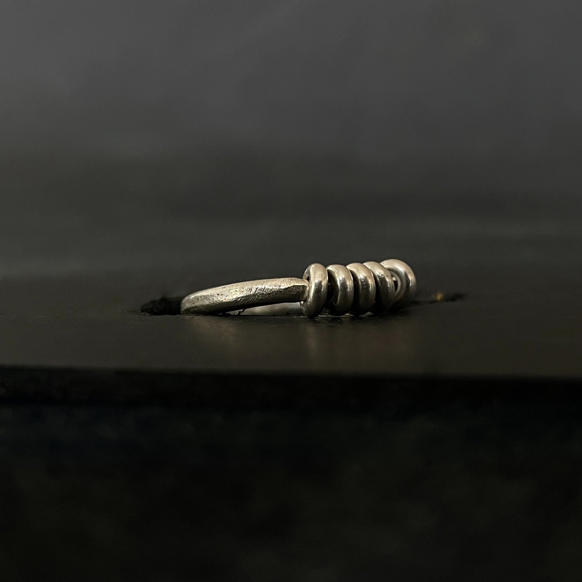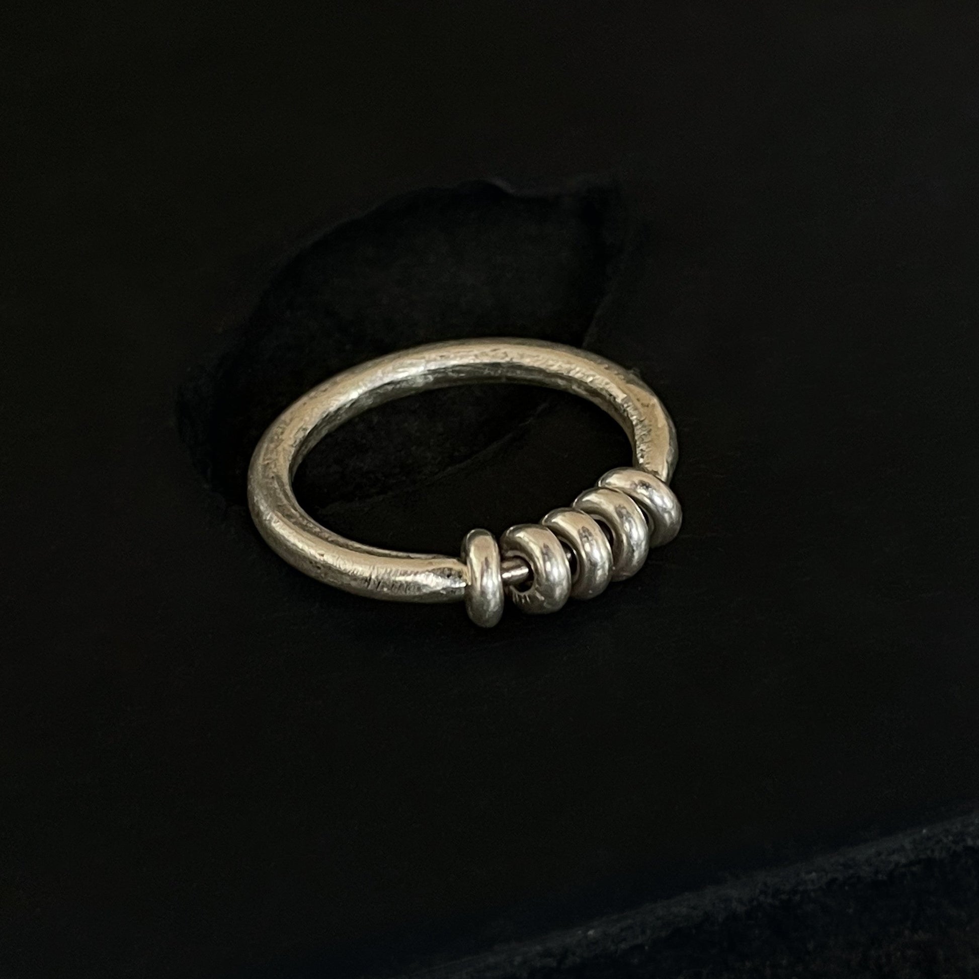 Sidabro žiedas su penkiais judančiais žiedeliais, kuriuos galima lengvai sukti pirštu. Šis judesys padeda nusiraminti, sumažinti įtampą ir suteikia rankoms malonų užsiėmimą.